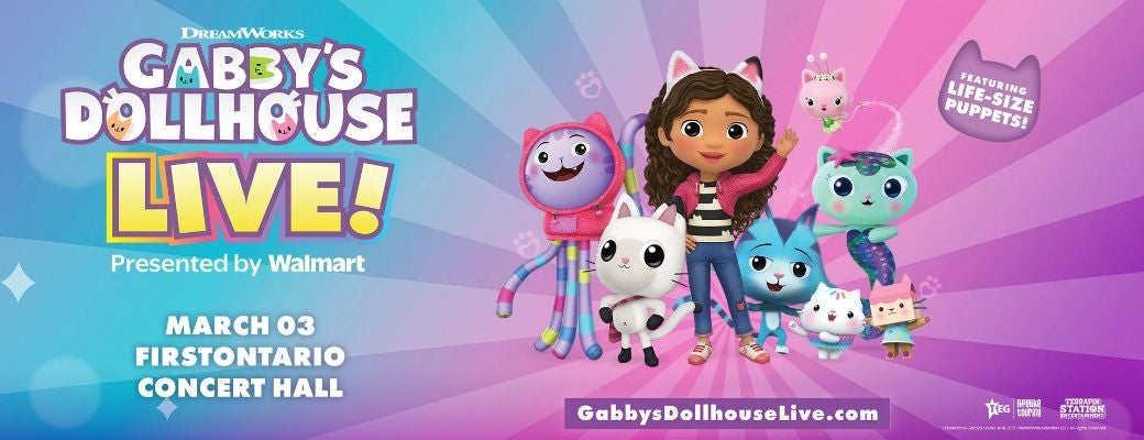 Gabby's Dollhouse Live! Presented by Walmart brings to life an original story featuring incredible puppets, dynamic staging, and songs that will have audiences singing and dancing along, from beginning to end. Presented by Terrapin Station Entertainment and TEG Life Like Touring, in association with Universal Destinations and Experiences.
